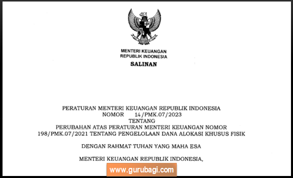 Pengelolaan Dana Alokasi Fisik DAK Fisik Tahun 2023 ini diterbitkan sesuai Peraturan Menteri Keuangan PMK Nomor 14/PMK.07/2023 tentang Perubahan atas Peraturan Menteri Keuangan Nomor 198/PMK.07/2021 tentang Pengelolaan Dana Alokasi Khusus DAK Fisik.
